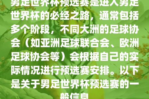 男足世界杯预选赛是进入男足世界杯的重要阶段,需要各支球队认真备战、全力以赴地参加比赛,对于足球迷来说,这也是观赏高水平足球比赛的好机会,如果想要了解具体的男足世界杯预选赛信息,可以关注相关足球协会或赛事官方的消息。