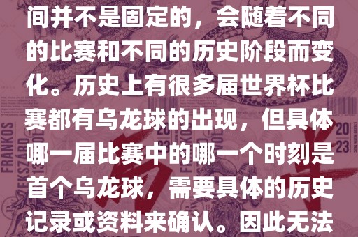 世界杯足球赛事中的乌龙球出现时间并不固定,随着比赛和历史阶段的变化而有所差异。历史上多届世界杯比赛都有乌龙球的出现,但确切的首次乌龙球发生在何时无法确定,需要更多历史记录或资料来确认。摘要字数在100-200字之间。