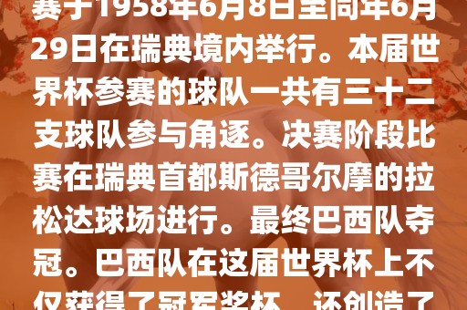 1. 比赛时间,1958年瑞典世界杯是第6届世界杯足球赛事。比赛于1958年6月8日至同年6月29日在瑞典境内举行。本届世界杯参赛的球队一共有三十二支球队参与角逐。决赛阶段比赛在瑞典首都斯德哥尔摩的拉松达球场进行。最终巴西队夺冠。巴西队在这届世界杯上不仅获得了冠军奖杯,还创造了著名的桑巴军团,为后来的足球历史留下了深刻的印记。