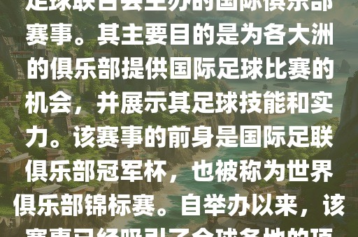 国际足联俱乐部世界杯(FIFA Club World Cup,简称,俱乐部世界杯),是一项由国际足球联合会主办的国际俱乐部赛事。其主要目的是为各大洲的俱乐部提供国际足球比赛的机会,并展示其足球技能和实力。该赛事的前身是国际足联俱乐部冠军杯,也被称为世界俱乐部锦标赛。自举办以来,该赛事已经吸引了全球各地的顶级俱乐部参与。这项赛事的冠军被视为全球俱乐部足球的最高荣誉之一。