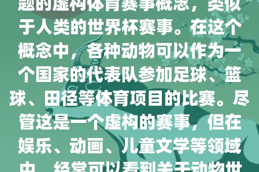动物世界杯是一个以动物为主题的虚构体育赛事概念,类似于人类的世界杯赛事。在这个概念中,各种动物可以作为一个国家的代表队参加足球、篮球、田径等体育项目的比赛。尽管这是一个虚构的赛事,但在娱乐、动画、儿童文学等领域中,经常可以看到关于动物世界杯的故事和情节。
